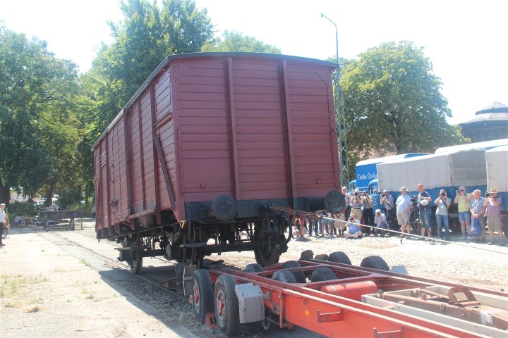 Auf dem Straßenroller wird der 10t schwere Waggon entsprechend gesichert, bevor....